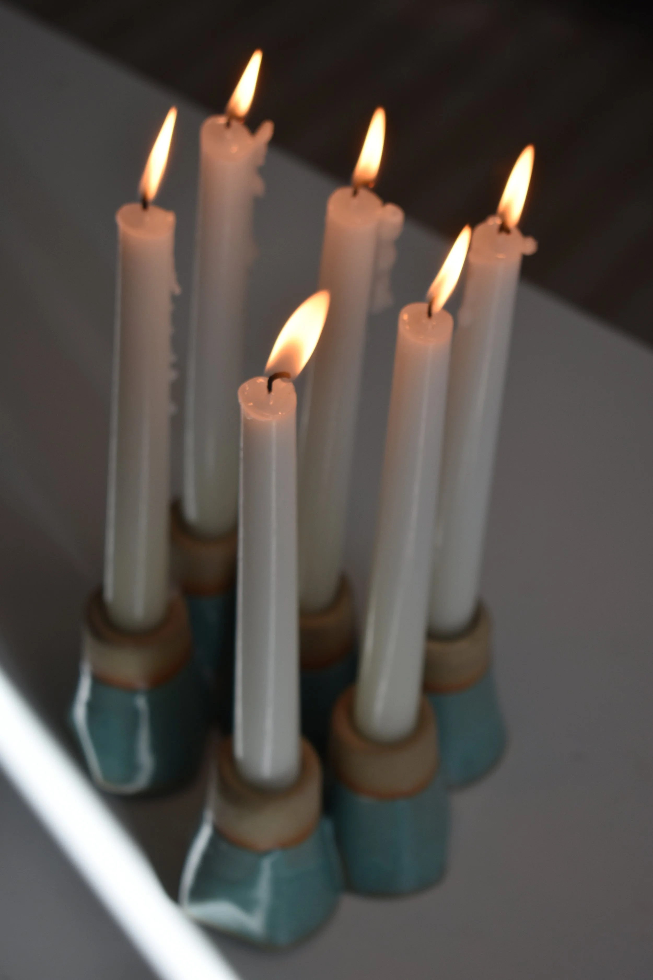 Designed with dual functionality in mind, this modular piece flips to serve as either an egg holder or a candle holder. One side displays eggs as a sculptural kitchen accent, while the other holds candles as a dining table centerpiece. Each slip-cast unit features a form between a circle and a pentagon, creating varied flat surfaces that make every arrangement feel unique.